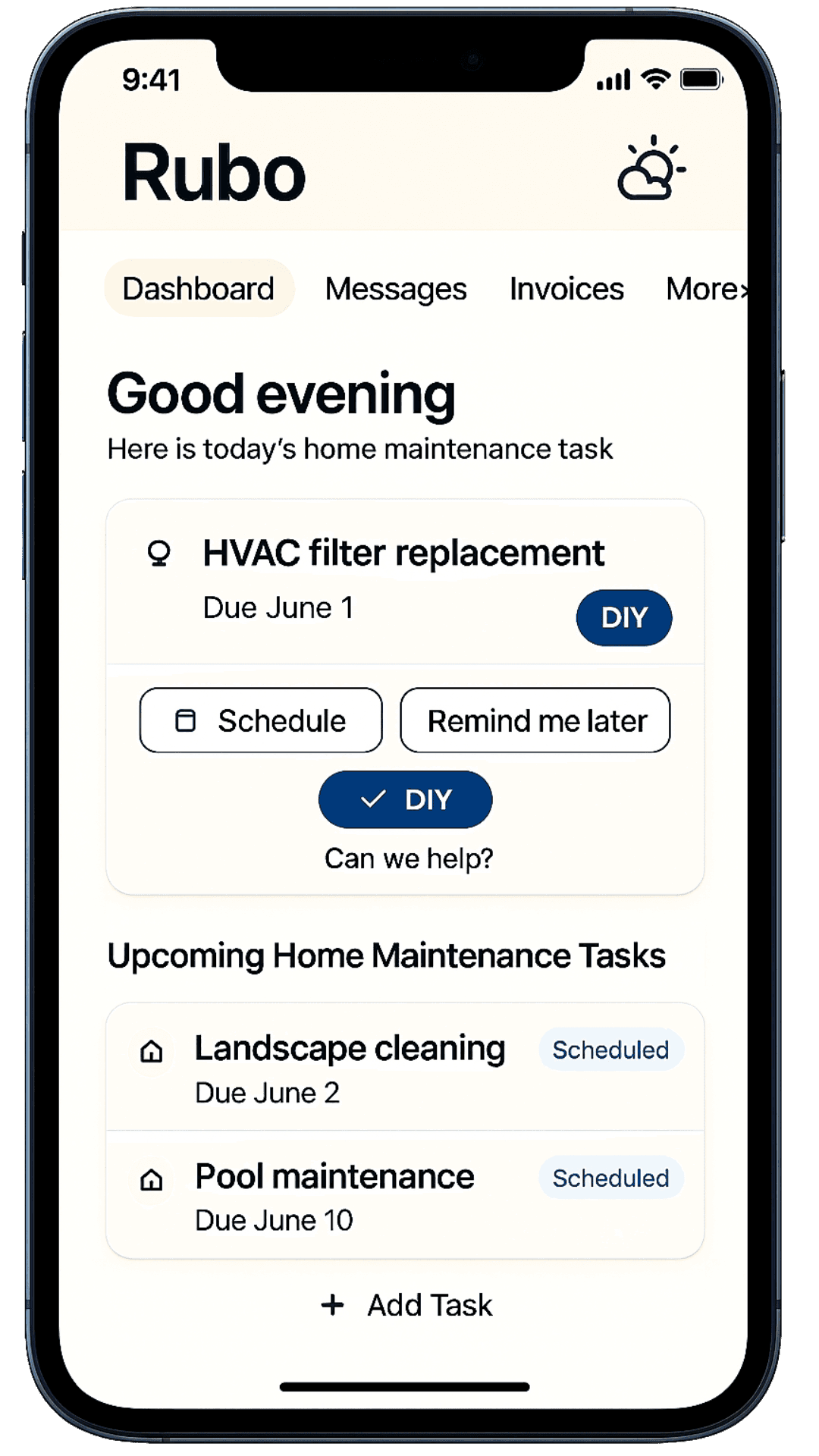 RUBO takes the stress out of home maintenance by scheduling seasonal and annual tasks, offering DIY guidance, reminding you when it’s time to book contractor appointments, sending timely alerts, and keeping everything on track so nothing slips through the cracks.